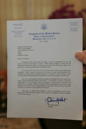 吉爾曼、伍爾夫前眾議員也分別轉致美國眾議院議長海斯特(Dennis Hastert)親函及由三十位聯邦參眾議員所錄製的致賀陳總統、呂副總統連任影帶,對於他們的盛情及對台灣的堅定支持,副總統也請訪賓代為轉達她的感謝之意。她並向兩位前美國聯邦眾議員說明選舉前一天遭槍擊的相關經過,她說,從政以來歷經入獄、罹患癌症及遭受槍擊,可謂已走過惡夢。