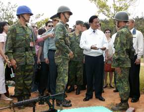 陳總統水扁先生今天上午前往成功嶺營區視導及慰勉新訓官兵,總統首先聽取單位任務簡報,隨後轉赴訓練場地實地瞭解新訓弟兄射擊預習操練、單兵戰鬥教練演練情形,以及視導替代役訓練班體能訓練情形。中午,總統則和官兵弟兄會餐,並預祝大家端午佳節平安快樂。