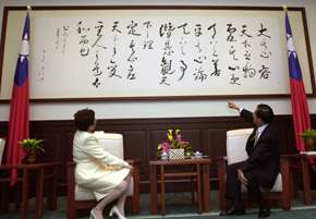 總統也向訪賓介紹總統府會客室「台灣綠廳」的佈置,有象徵美麗寶島的山、水、鳥、蝶的地毯,及原住民圖騰的窗簾框,顯示我們重視自然生態,也不忘本。