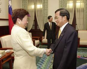 鄭總裁及其夫婿Integral Communications公司總裁辛永光,下午由經濟部次長施顏祥、高雄縣縣長楊秋興陪同,前來總統府晉見總統。總統府秘書長陳師孟也在座。