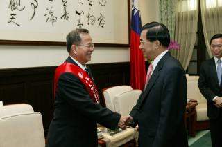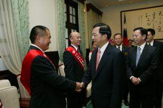 第廿八屆全國十大傑出農業專家當選人林淵煌(農委會技正)、翁仲男(台灣動物科技研究所所長)、黃福祥(台東區農會總幹事)、林宗賢(台大園藝系教授)、林長平(台大植物病理與微生物學系教授)、王富豪(口湖漁類生產合作社經理)、江瑞拱(農委會台東區農業改良場研究員)、劉新裕(農委會農業試驗所研究員)、游俊明(農委會桃園區農業改良場研究員)、邱正祥(瑞祥農場負責人),上午由國際同濟會台灣區總會總會長吳文樑及行政院農委會主任委員李金龍陪同,前來總統府接受總統道賀,總統府副秘書長卓榮泰也在座。