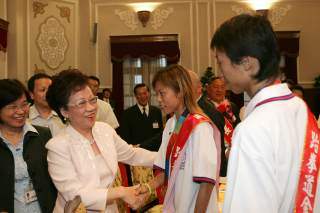 副總統也勉勵在場的選手與教練,在二○○八年的北京奧運中,可以贏得更好的成績。她表示,這次台灣在二百零二個參賽的會員國中,得獎牌數名列第三十七,總成績名列第三十四,以台灣二千三百萬人口在全世界一百九十一個國家中排名四十五來看,這樣的成績十分難得。然而如果從我國名列第二十五的個人所得及名列第十六的全國生產所得來看,我們的總成績應該還有再往上提昇的空間。