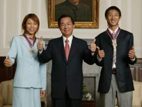 昨天阿扁特別撥冗探望兩位「犧牲小我、完成大我」的無名英雄,包括我們徐明老師與徐生明總教練的時候,我特別當場問我們體委會陳主任委員,二○○八北京奧運很快就到,台灣有沒有機會再奪金牌,我們可以拿到幾面的金牌?陳主任委員毫不考慮的說,要拿五面金牌,我說應該是五面加上現在兩面是七面金牌,「二○○八Lucky seven,大家拚了;二○○八前進北京、勇奪七金」,再次與大家互相勉勵,阿扁與政府一定會做大家最有力的支持與後盾,最後敬祝大家身心健康、萬事如意!謝謝大家!