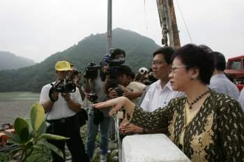 呂副總統秀蓮女士今天上午邀請學者專家及總統府科技諮詢委員會委員共同前往石門水庫視察,並關心桃園地區供水狀況。副總統除聽取經濟部水利署長陳伸賢及北區水資源局局長李鐵民所作的簡報外,並請同行的學者專家們提供意見供主管機關參考;隨後,副總統一行並至水庫壩頂勘查,了解水庫淤積及除沙情形。