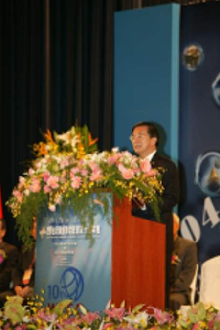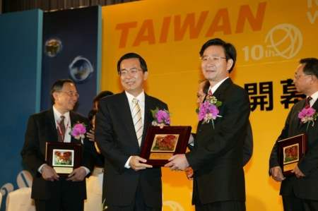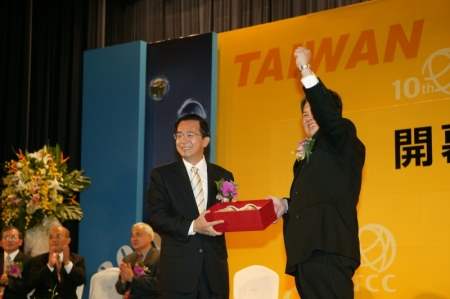今天非常高興能夠參加世界台灣商會聯合總會第十屆年會開幕典禮,看到全球各地台商朋友不遠千里,各自放下手邊的事業,回到台灣,為推動會務貢獻智慧與心力,並以具體行動來表達對台灣的熱愛與支持,阿扁在此要代表政府與人民向各位表達最高的敬意與由衷的歡迎之意。阿扁同時也要藉此一機會,感謝各位台商朋友們,在阿扁每次出訪期間,不論是去中南美洲、非洲,或是過境美國,或者是吳淑珍女士這次率團到雅典時,所給予的熱烈歡迎與支持,再次感謝大家,謝謝各位!