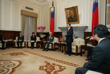 陳總統水扁先生今天上午接見來台參加「台日論壇」日本代表團,除代表中華民國政府與人民歡迎訪賓的到訪並祝賀論壇所達到成果外,也藉接見機會向賓客說明政府對相關議題的立場。