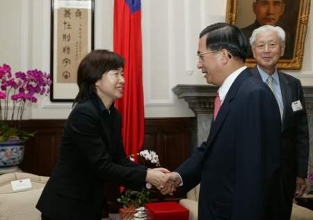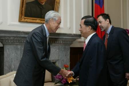 來台參加「台日論壇」的日本代表團上午由日本世界和平研究所董事長大河原良雄(Okawara Yoshio)率領,在中華歐亞基金會董事長張京育陪同下,前來總統府晉見總統。