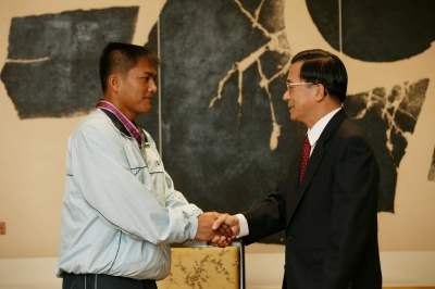 陳總統水扁先生暨夫人今天上午在總統府接見參加二00四雅典帕拉林匹克運動會選手,總統並親頒「五等景星勳章」給獲得金牌的兩位選手─江志忠先生與林資惠小姐,以表彰他們在體育方面的傑出表現。