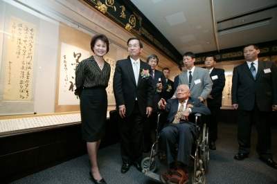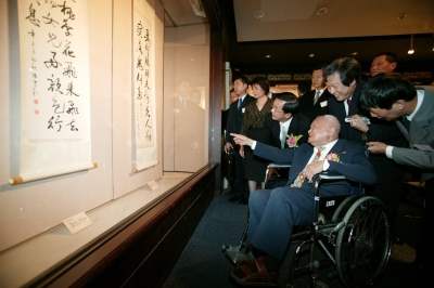 阿扁深知,陳大師從小受到良好的書法基礎訓練,早年為了練就腕力,每天一大早拿著鐵桿的毛筆練字,之後留學日本更專心臨摹日本書道家的字帖。陳大師融合了「日本文化」與「台灣文化」的獨特書法風格,備受書法界高度推崇,是台灣第一代的書法大師。在陳大師身上,阿扁感受到藝術大師的風範,也為陳大師身居高齡,仍對書法充滿熱愛的精神感到佩服。這次「歷史博物館」特別選在「國家畫廊」舉辦陳大師的百歲書法展,不僅是代表國家重視我國優秀的藝術家,更希望帶動國人寫書法的風氣,藉由陳大師的大作,來見證我國百年來的書法史。
