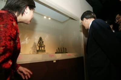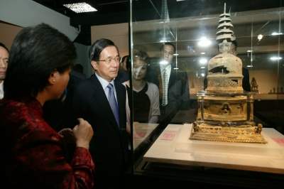陳總統水扁先生今天下午特別前往國立故宮博物院參觀「法像威儀-彭楷棟先生捐贈文物特展」,對於彭老先生慨然捐獻三百多件文物供國立故宮博物院典藏,這番用心與愛心讓大家非常感激與感動。