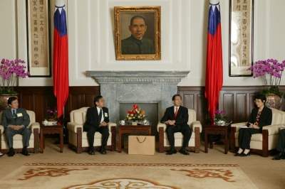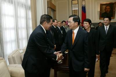 陳總統水扁先生今天上午接見「第十二屆經濟部產業科技發展獎」得獎企業代表,除向得獎企業及個人表達祝賀外,並期許他們繼續本著「全球思考、在地行動」的研發願景,「不畏艱難、勇往直前」,為台灣的未來,繼續攜手打拼。