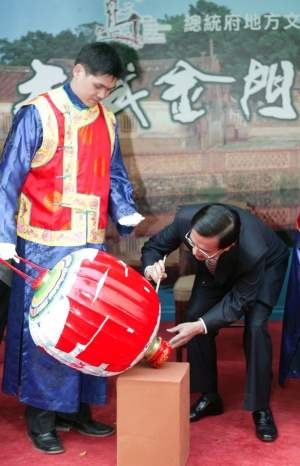 陳總統水扁先生今天下午參加「大哉金門 閩南原鄉」總統府地方文化展-金門縣開幕記者會。總統在歡慶迎娶樂聲中,由金門傳統子婿燈儀仗引導步入會場,除致詞期許金門縣由「戰地前線」的角色轉變成「兩岸的機會之窗」,再進一步「讓兩岸認識金門,讓金門走向世界」,並與總統府副秘書長卓榮泰、行政院文化建設委員會主任委員陳其南及金門縣長李炷烽一同在在子婿燈上彩繪開光,最後總統也與貴賓們舉起獨特的一口杯,以金門高梁向金門鄉親們致意。