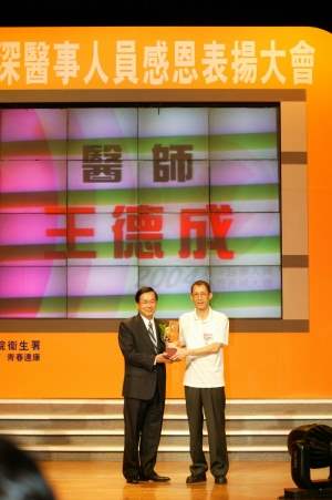 早期台灣環境艱苦,醫療與衛生貧瘠,民眾的衛生保健常識不足,在座的各位便是在當時的環境下,投入醫療的服務工作,其中的辛苦可以想見,然而各位固守在崗位上,汲汲奉獻了大半生的時間,那種毅力與堅持自然是外人無法想像的。在人類社會面臨醫療防疫的種種挑戰時,包括SARS、人道或災難救援,我們總是可以在第一線看到醫事人員忙碌的身影,醫事人員對醫療照護始終如一的付出,早已在台灣社會的各角落,創造了許多「仁者與大愛」的故事。相較於以往,台灣在經濟發展與教育普及後的今日,或許環境富裕便利了,然而人與人互助互諒的精神,卻變的淡漠與疏離,阿扁熱切期望能藉由更多理性的和解和良性的溝通,讓不只是醫療的各崗位階層,都能逐漸找回人性的光輝與良善,也尋回人與人之間良好的互助、互動關係,創造和諧的新台灣!