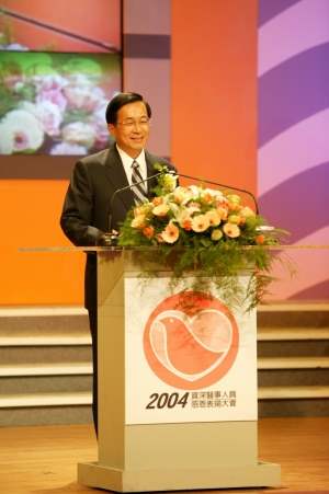 陳總統水扁先生今天下午參加由行政院衛生署所舉辦的 「二00四資深醫事人員感恩表揚大會」,代表政府與全體國人同胞向所有一生為醫療奉獻心力,獲得表揚的資深醫事人員們,表達最誠摯的謝忱與感佩之意,並希望透過表揚大會,將大愛精神傳播出去,使其傳承延續在台灣社會的每個角落裡。