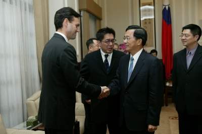 「二00四年第三屆台北國際雜誌研討會暨展覽會」與會訪賓一行十餘人,下午由台北市雜誌商業同業公會理事長詹宏志陪同,前來總統府晉見總統,總統府副秘書長卓榮泰也在座。