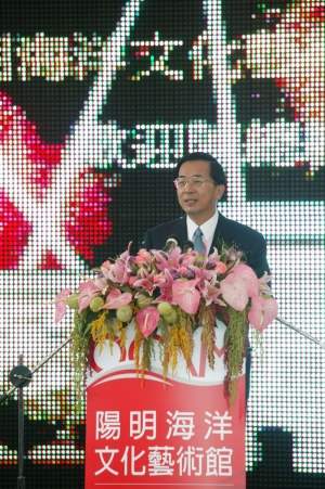 近年來,政府及民間部門在海洋文化藝術的推展上有了許多的努力及成效,包括:推展港市文化節活動、漁業漁村文化活動、提倡海洋音樂文化、以及海洋信仰祭典儀式的文化等等。而今天,我們也很高興看到陽明海運的海洋文化藝術館,在基隆這個台灣過去最繁忙的海港城市適時適地的推出,阿扁相信,民間自主參與以及社會力的強化,都將是政府推展海洋文化事務的最佳伙伴,對於發展海洋文化、豐富市民海洋文化藝術生活空間,也格外的具有意義。