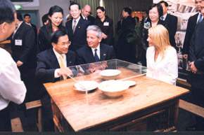 總統與宏國馬度洛總統一行,首先前往南投縣草屯鎮參觀台灣手工藝研究所,在參觀早期農村文物時,總統親自為馬度洛總統介紹餐桌、爐灶、長板凳、食物儲櫃等日常器具,並邀請馬度洛總統一起坐在餐桌旁的長板凳上,共同體會昔日台灣農村生活景象。總統也說明,早期農村的餐桌不僅是全家人用餐的地方,更是孩子們讀書、寫功課的書桌。之後,兩位總統也在解說人員的介紹下,參觀陳培澤先生雕刻藝術展及張憲平先生的竹藝世界。離開手工藝研究所之前,馬度洛總統對於迎賓表演車鼓小戲(歌仔戲前身)表示高度興趣,再度佇足欣賞並與演出者合影留念。