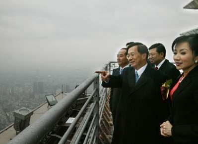 「台北101」整個興建的計畫,從阿扁擔任台北市長開始推動,馬市長就任後繼續給予全力的支持與協助。期間經歷了九二一及三三一的兩次大地震考驗,又因為航高的限制,從六十六層到八十八層到一百零一層,最後一度被要求變更設計,降為九十層,由五百零八公尺降為三百九十一點八公尺。但經過業主、台北市政府與中央民航單位的共同努力,讓原案能夠恢復,重新取得世界第一的地位。