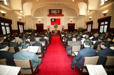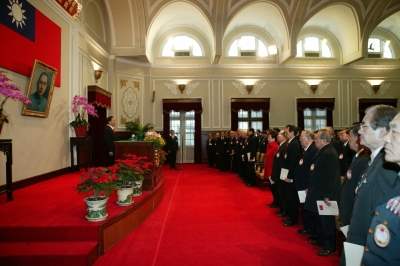 陳總統水扁先生今天在總統府大禮堂主持中華民國九十四年開國紀念典禮暨元旦團拜。上午九時正,總統由總統府秘書長蘇貞昌陪同蒞臨會場。呂副總統秀蓮女士、中央與地方政府高級官員都起立向總統致敬。
