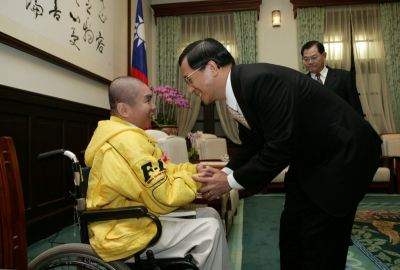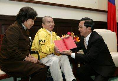 陳總統水扁先生今天接見盲人音樂家藍約翰先生,以「生命的勇士」為其新書提字,並盛讚其堅強的意志與旺盛的生命力。