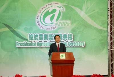最後,阿扁希望藉由「總統農業獎」的舉辦,鼓勵農業界的菁英,更有助於提升台灣農業的競爭力與發展。期許這些得獎者與入圍者,能夠發揮示範作用,成為帶領台灣農業向前邁進的尖兵,共同努力,永續利用資源,造福農漁民朋友,繼續為台灣農業貢獻心力,締造另一個經濟奇蹟-農業奇蹟。