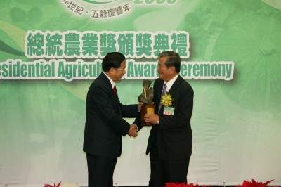 陳總統水扁先生今天參加「第一屆總統農業獎」頒獎典禮,親頒獎給兩位得獎人-「服務卓越獎」徐金錫、「農業和平獎」謝順景,並致詞。