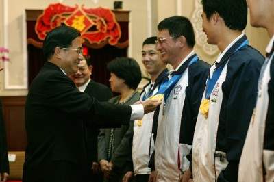 「二00五年墨爾本第二十屆聽障達福林匹克運動會」中華代表團全體隊職員一行七十餘人,由團長趙玉平領隊,行政院體育委員會主委陳全壽及中華民國聽障者體育運動協會理事長陳志和陪同,前來總統府接受總統致賀及表揚,總統府國策顧問、中華民國聽障者體育運動協會名譽理事長紀政及總統府副秘書長黃志芳也在場。