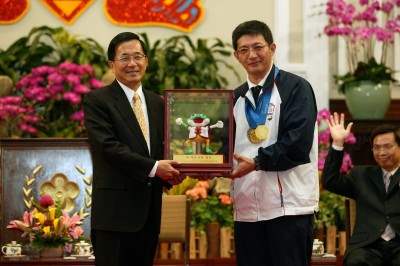 政府永遠是支持大家的最有力後盾,阿扁在未來的任期一定責由行政院及行政院體育委員會充分配合及支持,不論在經費及政策方面絕不會讓大家失望。因為二00九年是台灣體育界重要的一年,不僅聽障達福林匹克運動會在台北市舉行,世界運動會也將在高雄市舉行,一南一北相互輝映,這是我們的重責大任,我們一定全力以赴。