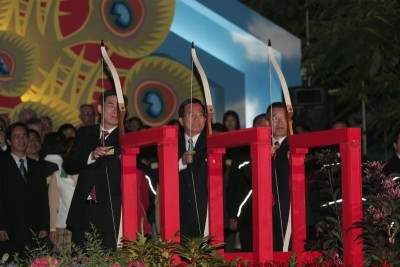 陳總統水扁先生今天晚間參加「二OO五高雄燈會旗鼓嘉年華」開燈儀式,並應邀致詞,致詞後總統並以拉弓方式為燈會點燈。