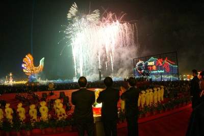陳總統水扁先生今天晚間至台南參加「2005台灣燈會」開燈儀式,並致詞。整個儀式在熱鬧的打擊樂聲引領下展開,在總統觸摸光電球的那一刻達到最高潮,主燈「鳳鳴玉山」開啟、大放異彩,隨後,總統也與現場民眾同歡,欣賞繽紛燦爛的煙火表演。