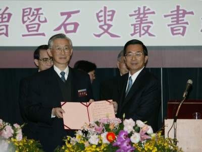 致詞後,總統並接受陳履安先生代表家屬所呈交的捐贈文物契約書及清冊,總統則代表政府頒贈感謝狀;隨後並與陳履安先生及國史館館長張炎憲共同按紐象徵石叟叢書線上正式啟用。