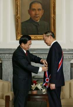 陳總統水扁先生今天頒授中正勳章予前監察院院長錢復,以表彰他長期配合國策、澄清吏治、保障人權、提振監察職權功能及健全民主政治發展的貢獻。