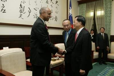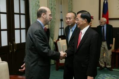 參加「國家通訊傳播政策國際學術研討會」的美韓日等國與會外賓一行十餘人,上午由行政院政務委員林逢慶及開南管理學院校長湯宗益陪同前來總統府晉見總統,總統府副秘書長黃志芳也在座。