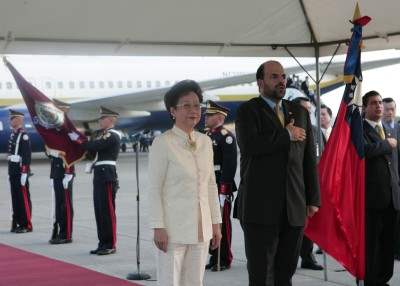 副總統在下午五時許抵達,隨即接受薩國政府隆重的歡迎儀式。薩國外交部次長賈利世於機梯旁恭迎副總統,在接受禮兵致敬及演奏兩國國歌後,副總統發表簡短致詞。副總統表示,去年她前來薩國參加薩卡總統的就職大典,不到一年的時間,她再度來訪,連同此次已是第三度訪問薩國,足証兩國邦誼的友好與深厚。副總統指出,薩爾瓦多共和國與中華民國的友誼自一九三三年開始,迄今已有七十餘年,此行她邀請國內政府官員與學者專家共一百五十餘位團員同行,展現了台灣全體人民對薩國的情誼,同時藉此提供台灣發展經驗,共同參與薩卡總統所規劃的國際航空城開發計畫,相信這兩天的訪問將會既愉快且成功。