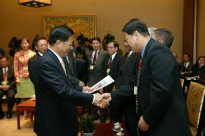 「全僑民主和平聯盟」暨北美洲分盟理事長李正三等由僑務委員會委員長張富美陪同前來總統府晉見總統。總統府秘書長游錫堃也在座。