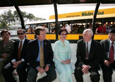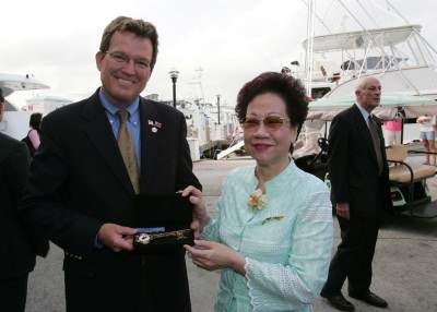 下午,副總統則前往羅德岱堡市(City of Fort Lauderdale)參觀。以往羅德岱堡市是美國僅存的水岸都市,城市景觀頗類似威尼斯,城內水道星羅棋布,由於二十世紀初先民將沼澤地用心整治,仿效威尼斯建城理念的模式經營,才成為今日的格局。如今伴隨經濟發展更吸引海運、製造、金融、保險、高科技與航太電子業等實業進駐。羅德岱堡市所展現的高品質生活水準,不僅擁有豐富的自然美,更因遊河區遊艇齊聚,而成為重要的休閒重鎮。由於該市遊艇多由台灣製造,副總統特地在市長Jim Naugle陪同及解說下,登上該市新建地標River House大廈實地瞭解市區規劃全景,並搭乘特製之水上計程車(Water Taxi)遊河,訪團其他成員與隨行媒體朋友皆同行,體驗濃厚的水上風情。Naugle市長最後並致贈市鑰予副總統,除做為紀念,更做為雙方情誼的見證。