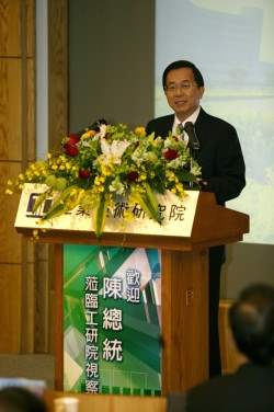 非常高興能夠再次來到「工研院」,誠如林董事長所說的,今天是阿扁就任總統後,第五次來到「工研院」,也是林董事長就任後的第一次,每次來都看到新的進步與發展,「工研院」不但帶動台灣產業的創新,對自己本身的創新也絕對不落人後。三十多年來,「工研院」為我國的半導體、資訊光電、材料科學、生物醫藥及能源科技等產業,不斷提供技術的支援,並積極將研究成果轉換成商業產品。依據國內管理學者的研究,「工研院」每投資1塊錢,就能產生11塊錢的營收與4塊錢的淨利,這樣的績效不但令人敬佩,更應該要好好珍惜與重視。
