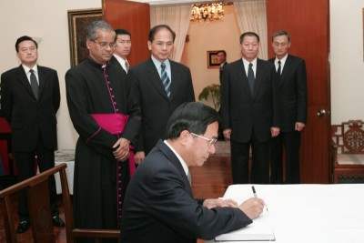 總統在教廷駐華代辦安博思蒙席、總統府秘書長游錫堃及外交部部長陳唐山陪同下首先向教宗靈前行三鞠躬禮,隨後並與安博思代辦晤談,表達對教宗蒙主榮召之哀悼與不捨。