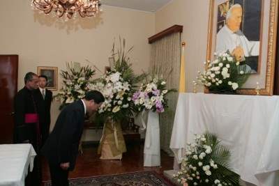 陳總統水扁先生今天下午前往教廷駐華大使館,代表中華民國政府及二千三百萬人民,為教宗若望保祿二世辭世表達最深摯的哀悼之意。