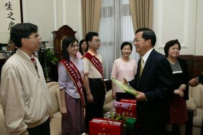 在此阿扁也對政府在照顧身心障礙者方面的不足,感到非常抱歉,我們一定會更加努力,只要各位有任何的遺憾、任何的不足,都是政府的責任。當然,不管政府再怎樣努力,都是有限的,有限的政府要結合無限的民間資源與力量,才能夠做許多事情,希望民間共同關注並協助讓身心障礙者過一個更有尊嚴、更美好的生活。再一次向大家致敬,也恭賀大家的得獎,同時向各位家長致上感謝之意,沒有大家不放棄的精神,今天我們就不會在總統府見面。