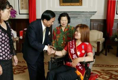 政府對於身心障礙者的照顧一向不遺餘力。早在阿扁擔任立委時代,就積極地共同推動身心障礙者的福利保障,而我的太太阿珍也是重要推手之一。我想大家應該都還記得去年我太太親自率領我國身障選手到雅典參加帕拉林匹克運動會,榮獲2金2銀2銅的佳績。當然我們還有很多改進的空間,也希望能與在座的得獎人與貴賓、家長們共同勉勵、一起努力。