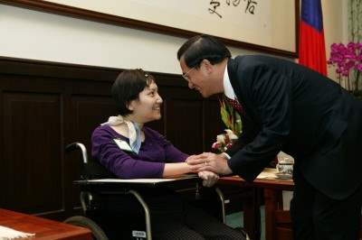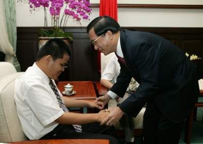 「黑暗中追夢」主角莊馥華、林偉智、呂文貴及其家人,與導演萬明美教授、影片指導萬仁導演、惠明學校校長陳麗玉等,下午由國科會主委吳茂昆陪同,前來總統府觀賞影片,並接受總統祝賀,總統府副秘書長黃志芳也在座。