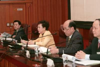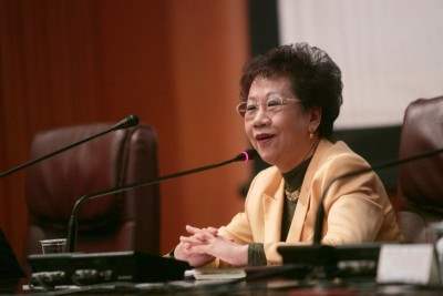 針對國民黨主席連戰近日訪問中國一事,副總統也發表看法表示,連主席此行對台灣是福是禍,勢必影響到我們的公義、幸福與人權。她提出此事的「三大荒謬」與台灣在此一事件上將面對的「四大危機」。所謂「三個荒謬」即是:第一、在台灣經過兩次選舉失敗的政治人物現在變成紅朝新貴,令人錯愕;第二、主政台灣五十餘年的政府,過去主張反共,造成兩岸的緊張關係,現在失去政權後,搖身一變為親共;第三、中國不久前展開排日、反日浪潮,現在卻發動另一批人熱烈迎接連主席訪問;第四、打著和平名義,但於中正機場發生的流血事件,傷透了國人同胞的心。一趟名為「和平之旅」,卻在國門發生如此激烈血腥衝突,這又是另一荒謬之處。