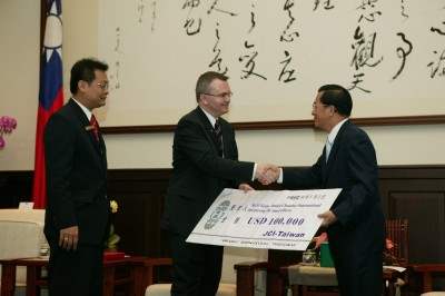 最後,總統並代表中華民國青商總會致贈該會所捐出的十萬美元給國際青商總會,支持其繼續致力於全球公益事業的服務目標。
