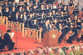 音樂是普世共通的語言,可以無遠弗屆跨越時空,為芸芸眾生帶來心靈的祥和與喜悅。今年雙十佳節,行政院文建會在立法院王院長金平帶領「國慶籌備會」所有工作同仁的協助下,辦理「國慶快樂頌-全國星空音樂會」,意義特別不同。因為阿扁上任以來,為了呈現文化的多元活潑,將原本的「介壽館音樂會」改名為「總統府音樂會」,舉辦的地點當然也不再侷限於總統府內的介壽館、南苑,受邀演出的對象也由古典音樂家、團體,擴大到喜愛音樂的各個團體及族群,主要的目的就是希望藉著悠揚的樂聲縮短人與人的距離,以文化促進社會的祥和。