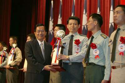 這份難得的殊榮,代表了在座各位平日對國軍的關懷與支持、對建軍備戰任務的投入和辛勞付出,不但深獲認同與肯定,更足以作為效法的典範。阿扁也要特別向全體楷模的眷屬們表達最高的敬意,由於各位的犧牲奉獻,給予堅守崗位的官兵弟兄們支持和鼓勵,才能造就今天這麼優秀的國軍楷模。