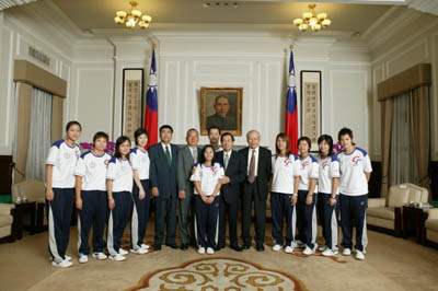 「2005年第7屆世界運動會」得獎選手及教練一行,上午由團長黃大洲、行政院體育委員會主委陳全壽陪同,前來總統府接受總統親自道賀。