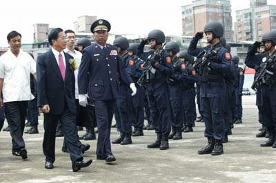 陳總統水扁先生今天上午前往保安警察第一總隊視察內政部警政署「快速打擊犯罪特警隊」。總統首先抵達特警隊裝備展示會場,參觀各項先進偵防、攻堅、鑑識及防爆器材。負責向總統進行簡報的是在圍捕槍擊要犯張錫銘時受傷的刑事警察局警備隊唐嘉仁隊長,總統特別垂詢他傷口復元情形,並握手致意表達感謝。隨後並校閱特警隊,包括維安、霹靂警力、反綁架任務編組、樂隊、旗隊等計約200餘名人力。隨即觀賞特警隊所操演的攀降表演及實警演練。