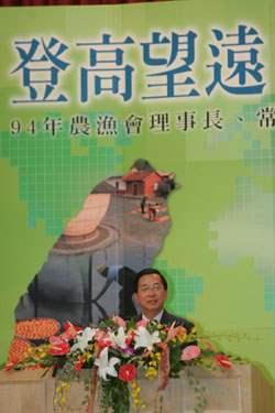 這幾年來,因為農業金融改革的成功,農漁會信用部的主管機關也依照大家的願望,由財政部轉給農委會來負責,「全國農業金庫」也已經順利來設立,做為各農漁會信用部的靠山和後盾,讓咱農漁會能夠健全來發展,繼續為咱農民朋友來服務。「全國農業金庫」成立的時候,受到各級農漁會全力的支持和配合,相關的股金一次就全部到齊,阿扁在這裏要特別向大家表示最高的敬意與謝意,希望咱農漁會在全新基礎之上和政府配合,共同為台灣的新農業繼續努力打拼。
