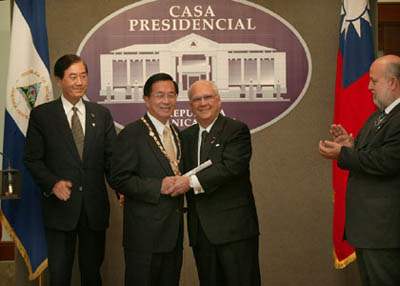 陳總統水扁先生於尼加拉瓜時間9月25日晚間(台北時間9月26日上午)獲贈象徵尼加拉瓜最高榮譽的「魯賓.達利歐大十字級項鍊勳章」。